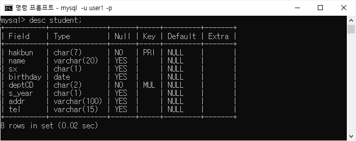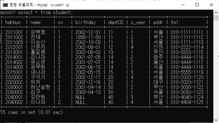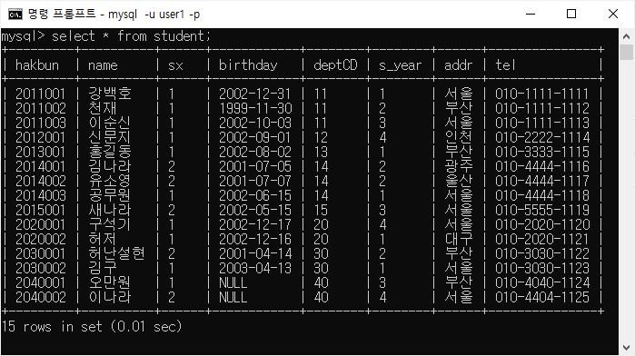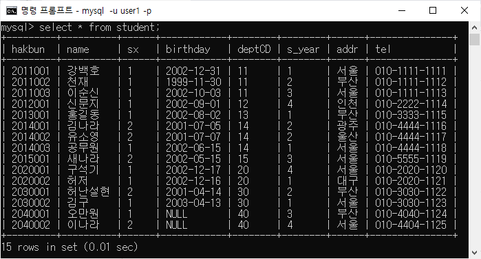 SQL의 INNER JOIN 구문으로 두 개의 테이블에서 조건이 일치하는 행만을 출력할 수 있습니다. Inner Join 구문의 형식은 다음과 같습니다. INNER JOIN SELECT 필드명들 FROM 테이블1 INNER JOIN 테이블2 ON 조건 WHERE 조건; 이 예제를 실행하기 위한 학생 테이블(student)과 학과코드 테이블(department)의 내용은 다음과 같습니다. INNER JOIN 위의 두 개의 테이블에서 학생의 학번, 이름, 학과명을 출력하는 SQL 구문입니다. SELECT student.hakbun, student.name, department.department FROM student INNER JOIN department ON student.deptCD = departme..
