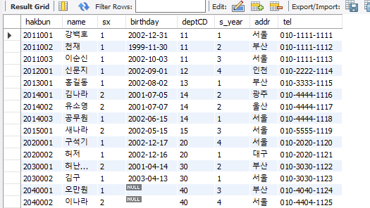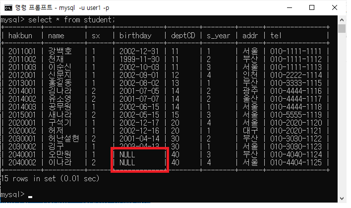 다음 코드를 살펴보겠습니다. mysql> select * from student; "birthday" 컬럼에 NULL 값이 있습니다. 검색 조건이 문자일때는 작은 따옴표를 사용해서 데이터를 묶습니다. 예를 들어, 성별(sx)은 문자 항목입니다. 성별이 '2'인 행을 검색할 때는 다음과 같이 입력합니다. select * from student where s='2'; 컬럼의 값이 숫자 항목일 때는 작은 따옴표를 사용하지 않습니다. 예를 들어, 학년(s_year)는 숫자 필드입니다. mysql> select * from student where s_year=1; 그러나 NULL 검색은 다음과 같이 하면 검색이 되지 안됩니다. select * from birthday=NULL; # 오류 select * from..