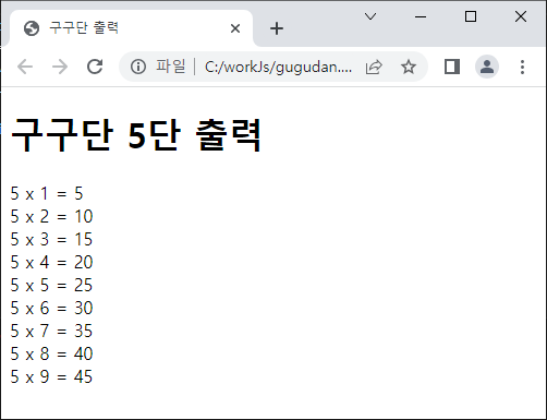 (자바스크립트) prompt 입력 받은 수의 구구단 출력하기 다음 코드는 구구단 5단을 출력하는 자바스크립트 코드입니다. 구구단 5단 출력 위의 5단을 prompt 함수를 이용해서 키보드로 입력받은 수로 변경해 보겠습니다. Javascript 2023.07.01