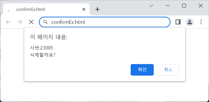 (자바스크립트) confirm 함수 예제 - [확인] [취소] 버튼 만들기 자바스크립트의 confirm 함수를 사용한 간단한 예제입니다. confirm 함수는 메시지를 출력하고, [확인] [취소] 버튼을 나타냅니다. 사용자가 [확인] 버튼을 누르면 true, [취소] 버튼을 누르면 false를 반환합니다. 아래의 예제에는 [확인] 또는 [취소] 버튼을 선택했을 때, 선택한 버튼을 받는 방법이 나타나 있습니다. Javascript 2023.06.30