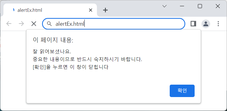(자바스크립트) 메시지를 출력하는 alert 함수 예제 alert() 함수는 사용자에게 메시지를 출력하는 용도로 사용됩니다. 출력되는 대화상자(dialog box)에는 [확인] 버튼 한 개만 있으며, [확인] 버튼을 클릭하면 대화상자가 닫힙니다. 이 함수의 반환값을 없습니다. Javascript 2023.06.30