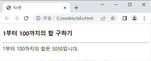 (자바스크립트) 1부터 100까지 합 구하기 다음 코드는 1부터 100까지의 합을 구하여 출력하는 javascript 코드입니다. 1부터 100까지의 합 구하기 위 코드를 prompt 함수를 이용해서 입력받은 수까지의 합을 구하도록 조금 수정했습니다. 1부터 n까지의 합 구하기 자바스크립트: 1부터 n까지의 합구하기 Javascript 2023.07.14