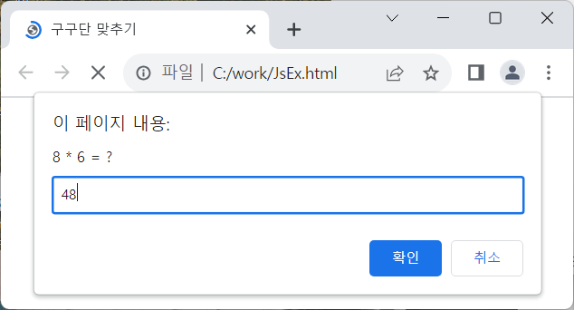 (자바스크립트) Math.random를 이용한 구구단 맞추기 게임 다음 코드는 구구단을 맞추는 자바스크립트 코드입니다. 종료는 prompt 에서 [취소] 버튼을 누르면 됩니다. 구구단 맞추기 실행했을 때의 결과 화면입니다. 문제를 출력합니다. 입력한 값이 정답이면 "맞았습니다!"를 출력합니다. 입력한 값이 틀리면 아래와 같이 출력합니다. [취소] 버튼을 누르면 종료합니다. Math.random() 0부터 1 사이의 임의의 실수 생성 Math.floor(a) 실수 a를 정수로 변환 Javascript 2023.07.21