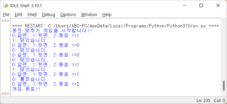 다음 코드는 파이썬의 time.sleep() 함수를 이용해서 카운트 다운을 만드는 예제입니다. time.sleep() 함수는 지정한 시간동안 멈춤니다. import time time.sleep(1) #1초 동안 멈춤니다. winsound.Beep() 함수로 "ㅃ ㅣ" 소리를 낼 수 있습니다. import winsound winsound.Beep(주파수, 시간) # 설정된 주파수와 시간으로 "삐" 소리를 냅니다. 다음 코드는 10, 9, 8, ... 0까지 카운트 다운을 하고, "삐" 소리를 내며 프로그램을 종료합니다. import winsound import time sec=10 for i in range(sec, 0, -1): print(f"{i}초 남았습니다..") time.sleep(1) print..
