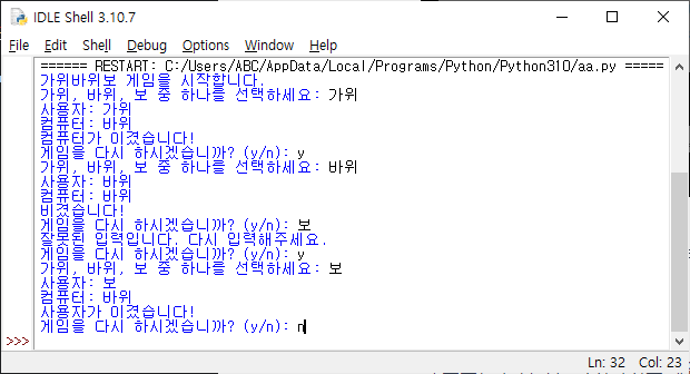 파이썬으로 만든 가위바위보 게임입니다. 사용자가 가위, 바위, 보 중에서 하나를 입력하면 컴퓨터가 임의로 가위, 바위, 보 중에서 한 개를 결정해서 누가 이겼는지 결정합니다. "게임을 다시 하시겠습니까? (y/n):"를 묻고, 게임을 다시 할 지 또는 종료할지를 결정합니다. import random def get_user_choice(): while True: user_choice = input("가위, 바위, 보 중 하나를 선택하세요: ") if user_choice in ['가위', '바위', '보']: return user_choice else: print("잘못된 입력입니다. 다시 입력해주세요.") def get_computer_choice(): choices = ['가위', '바위', '보'] ..